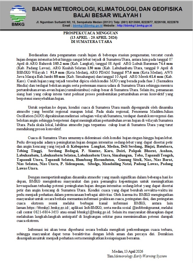 topmetro.news, Medan – Badan Meteorologi, Klimatologi, dan Geofisika (BMKG) memprakirakan kondisi cuaca di Sumatera Utara dalam sepekan ke depan, mulai 13 hingga 20 April 2026, berpotensi didominasi hujan dengan intensitas ringan hingga lebat. Fenomena atmosfer global seperti Madden-Julian Oscillation (MJO) serta pertemuan massa udara di wilayah ini menjadi faktor utama meningkatnya pembentukan awan hujan. Dalam beberapa hari terakhir, curah hujan…