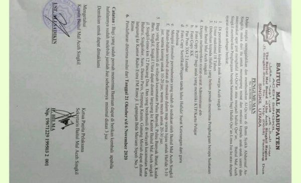 Hal ini diberitahukan pihak Baitul Mal Kabupaten Aceh Singkil melalui selebaran surat.