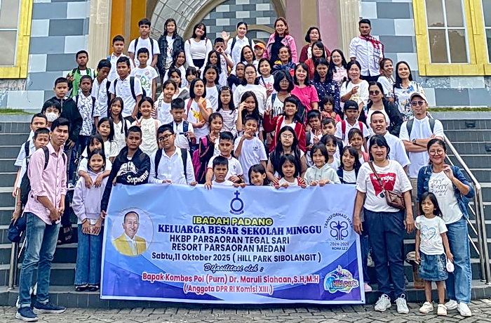 topmetro.news, Medan – Anggota DPR RI Kombes Pol (Purn) Dr Maruli Siahaan SH MH, diwakili Lukman Siahaan, memberangkatkan Rombongan Wisata Rohani Anak Sekolah Minggu HKBP Parsaoran Tegal Sari Ressort Parsaoran Medan, sebanyak 100 orang ke Hill Park Sibolangit, Sabtu (11/10/2025).