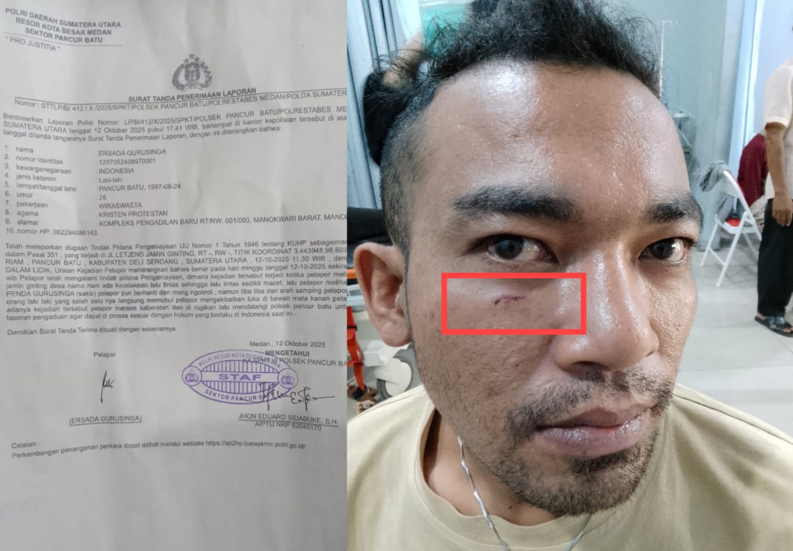 topmetro.news, Pancur Batu – Seorang warga bernama Ersada Gurusinga (28) melaporkan dugaan penganiayaan yang dialaminya ke Polsek Pancur Batu, Minggu (12/10/2025). Ia mengaku dipukul oleh dua orang tak dikenal (OTK) saat berada di lokasi kecelakaan lalu lintas.