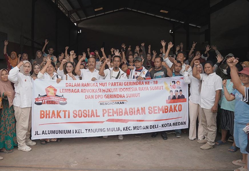 topmetro.news, Medan – Dalam rangka memperingati Hari Ulang Tahun (HUT) Partai Gerindra, sayap partai melalui Lembaga Advokasi Hukum Indonesia Raya Sumatera Utara menggelar kegiatan bakti sosial dengan menyalurkan bantuan sembako kepada warga di Jalan Aluminium, Kelurahan Tanjung Mulia, Kota Medan.