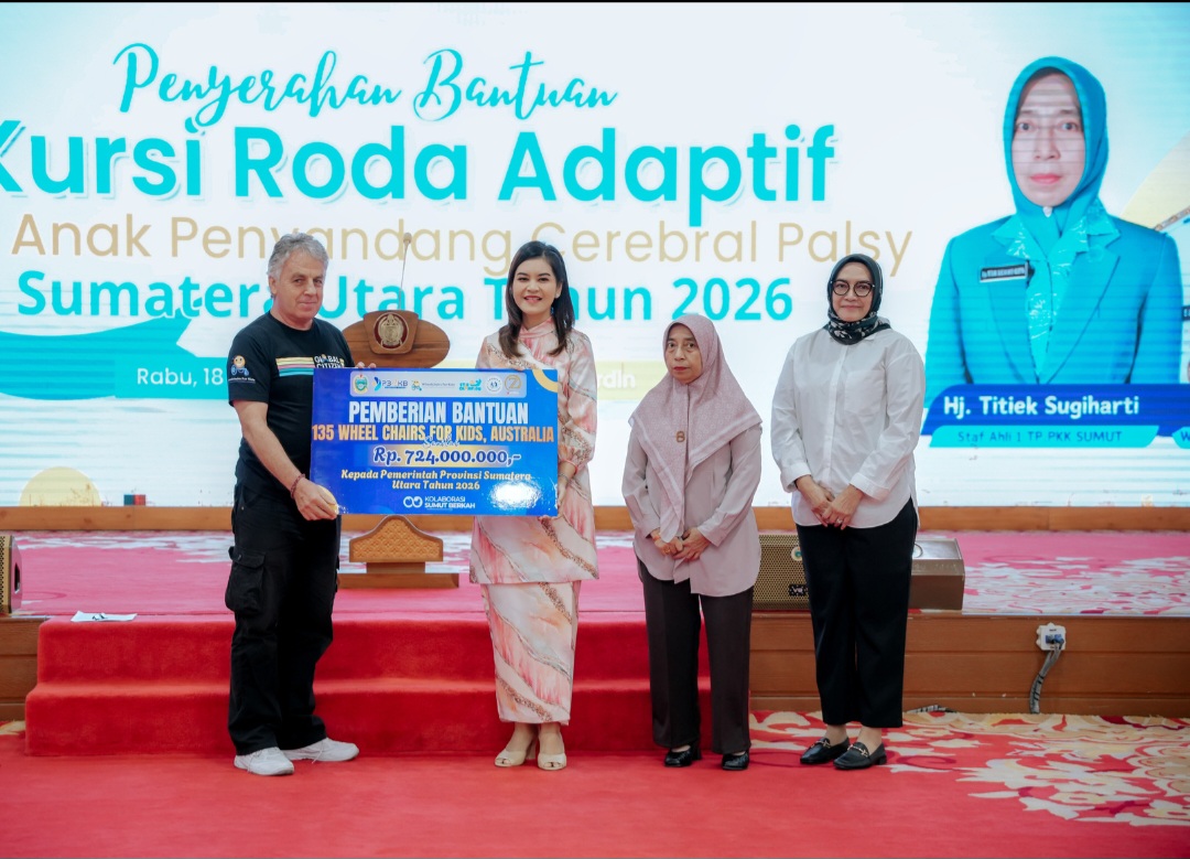 topmetro.news, Medan – Ketua Tim Penggerak Pemberdayaan dan Kesejahteraan Keluarga (TP PKK) Provinsi Sumatera Utara (Sumut) Kahiyang Ayu, menyerahkan secara simbolis 135 kursi roda adaptif bagi anak penyandang Cerebral Palsy (CP) di 12 kabupaten/kota se-Sumut. Penyerahan bantuan dilakukan bersama Direktur Global Village Foundation, Mr Andy Baracey, di Aula Tengku Rizal Nurdin, Jalan Sudirman, Medan, Rabu (18/2/2026).