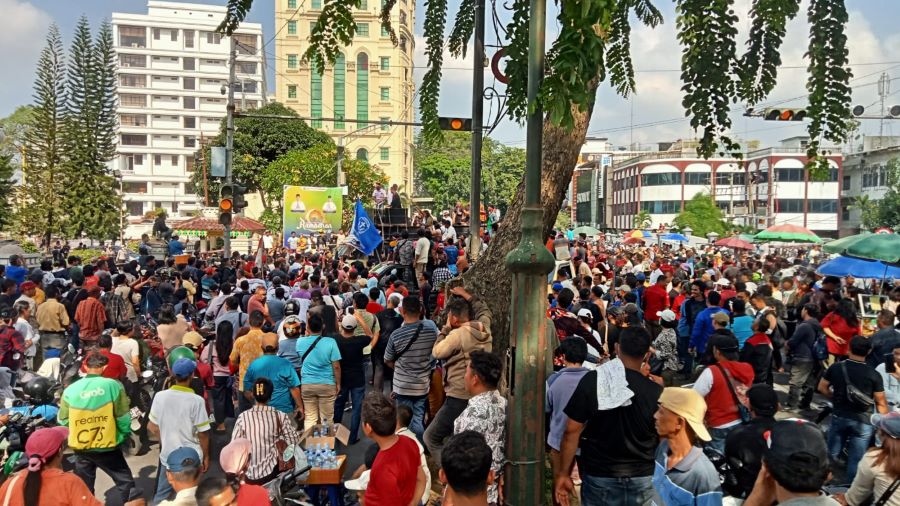 Aksi demo ini berlangsung dengan tertib, namun sempat diwarnai dengan aksi yang saling dorong-mendorong bersama pihak aparat kepolisian. Polisi, Satpol PP dan pihak TNI yang berjaga di lokasi berusaha menenangkan massa dan membuka komunikasi dengan perwakilan demonstran.