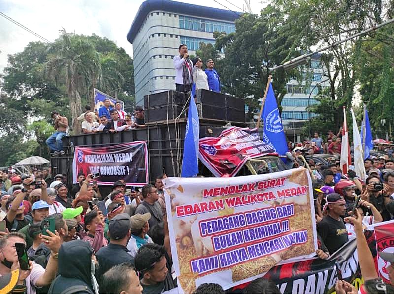 Para pendemo memprotes Surat Edaran Wali Kota Medan No 500-7.1/1540 yang diduga menimbulkan keresahan dan ketidakpuasan di kalangan masyarakat pedagang babi dan konsumen.