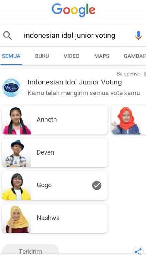 Menurut Shamsul Juentak, kali ini teknis mendukung para finalis Indonesia Idol Junior dengan cara voting di google. Caranya, di menu searching ketik INDONESIA IDOL JUNIOR VOTING dan contreng foto Gogo, pria berbaju kuning di situ.