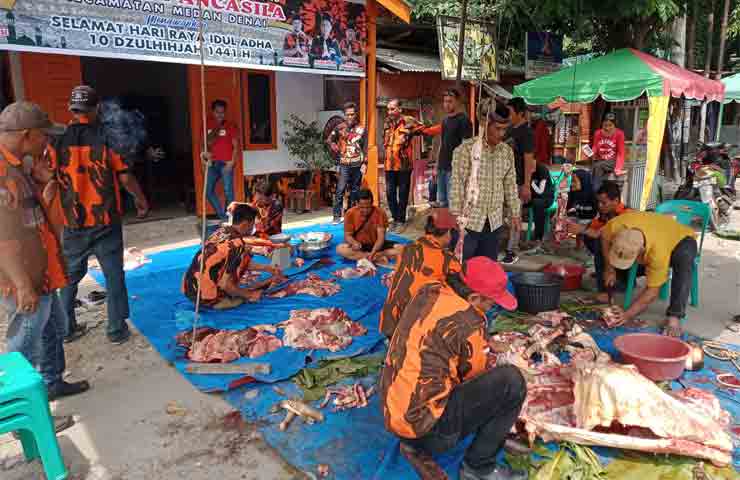 topmetro.news – Sebagai wujud kepedulian dan berbagi terhadap sesama, PAC Pemuda Pancasila Medan Denai, menyembelih 2 ekor sapi dan 1 ekor kambing pada perayaan Idul Adha 10 Djulhizah 1441 Hijriah. Dan dibagikan kepada kaum dhuafa di Kecamatan Medan Denai, dan juga kepada keluarga besar PAC PP Medan Denai, pada Sabtu(1/8/2020) di Sekretariat Jalan Denai, Medan