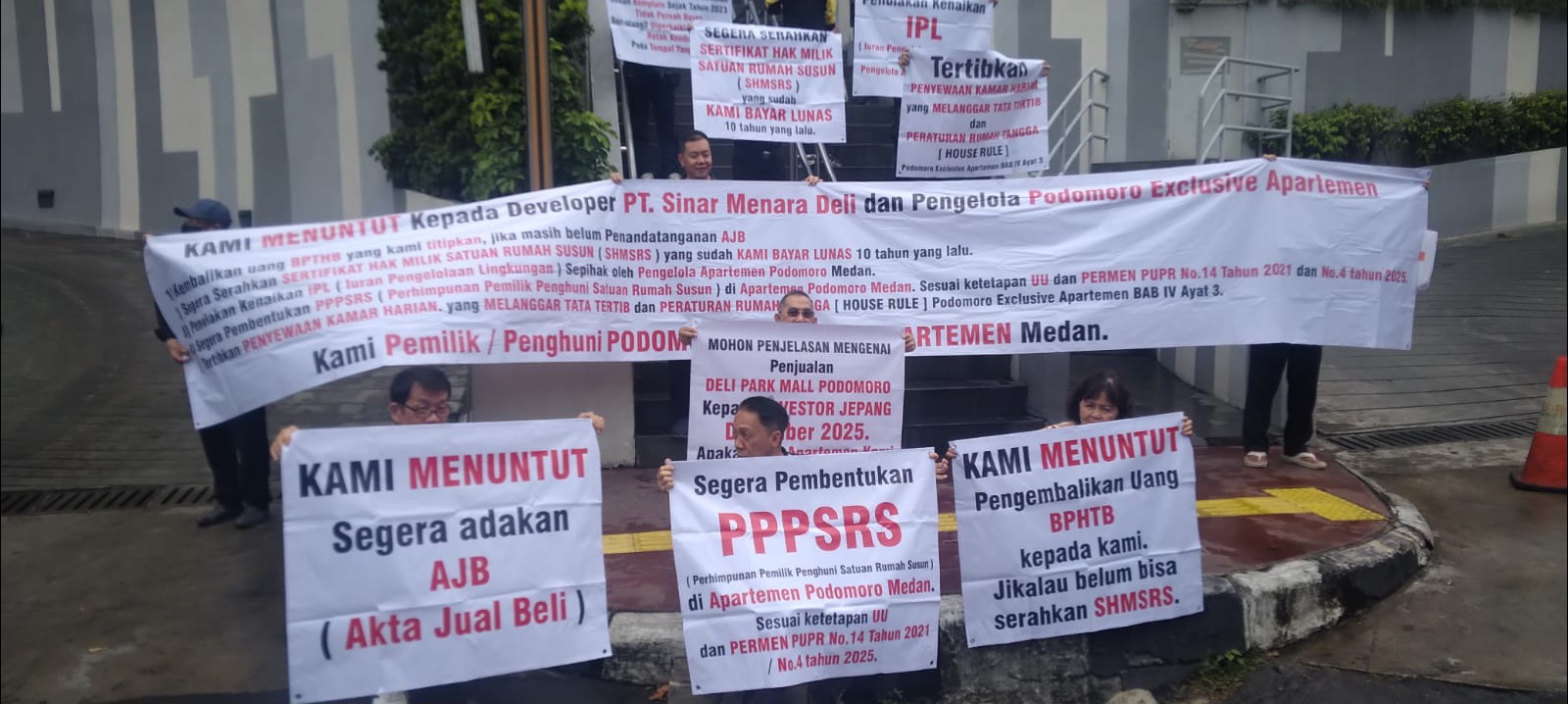 topmetro.news, Medan – Belasan pemilik dan penghuni Apartemen Podomoro City Deli yang tergabung dalam Perkumpulan Podomoro Deli Medan Bersatu kembali menyuarakan aspirasi mereka, dengan unjuk rasa damai di sekitar gedung PT Sinar Menara Deli, Jalan Guru Patimpus, Kota Medan, Kamis (9/4/2026). Aksi ini merupakan bentuk protes atas berbagai persoalan yang hingga kini belum menemukan titik terang, meski sengketa hukum telah…
