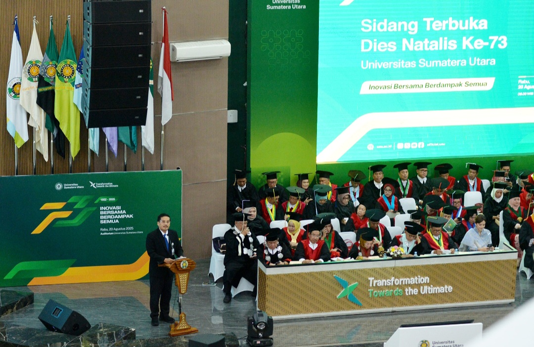topmetro.news,Medan– Pemerintah Provinsi (Pemprov) Sumatera Utara (Sumut) mengapresiasi kehadiran Universitas Sumatera Utara (USU) dalam memberikan kontribusi nyata bagi pembangunan. Tidak hanya terbatas pada dunia pendidikan, tetapi juga hadir di berbagai lini kehidupan bangsa. Hal itu disampaikan Sekretaris Daerah Provinsi (Sekdaprov) Sumut Togap Simangunsong, mewakili Gubernur Sumut Bobby Nasution, pada acara Sidang Terbuka Dies Natalis ke-73 USU, di Gedung Auditorium USU,…